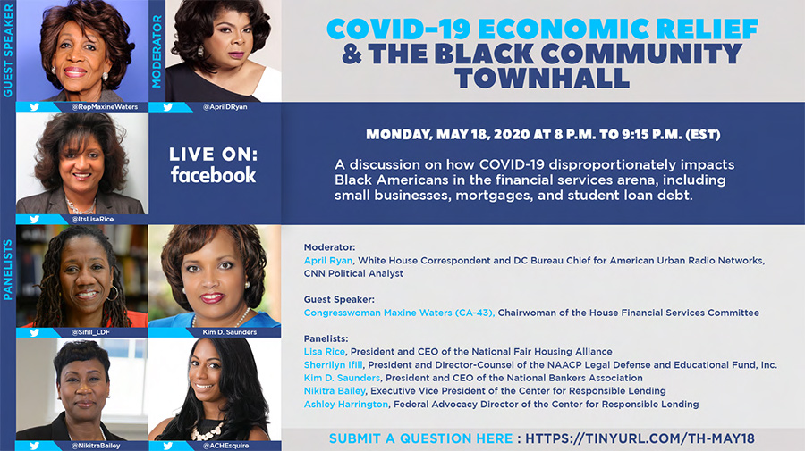 In May 2020, CRL hosted a Facebook Live Town Hall, "COVID-19 Economic Relief and the Black Community," featuring Representative Maxine Waters; NAACP Legal Defense Fund and Educational Fund President and Director-Counsel Sherrilyn Ifill; and CRL Board member Lisa Rice among others.